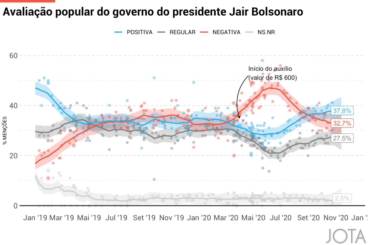 O presidente Jair Bolsonaro (sem partido) termina o 22º mês de governo com avaliação positiva indicando leve alta, com 37,8% da população adulta avaliando seu governo como ótimo/ bom. A avaliação negativa (ruim e péssimo) também recuou no período, e hoje está em 32,7%. Há quatro semanas, ele tinha 35,9% de avaliação positiva e 35% de avaliação negativa. Já a avaliação regular que era 26,4% hoje está em 27,5%. Os dados fazem parte da atualização mais recente do agregador de popularidade do JOTA Labs.