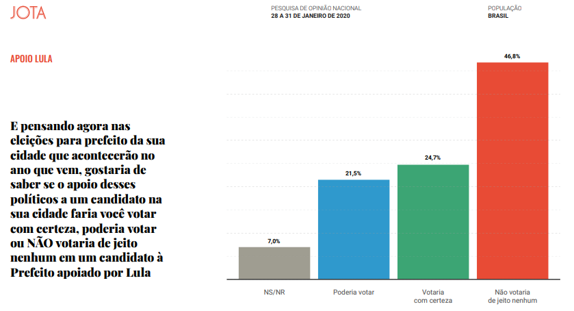 O apoio de Lula a um candidato da cidade do entrevistado faria 46,8% não votarem no candidato. Já 24,7% afirmam que votariam com certeza e 21,5%, que poderiam votar no candidato apoiado por Lula – 7% não responderam.