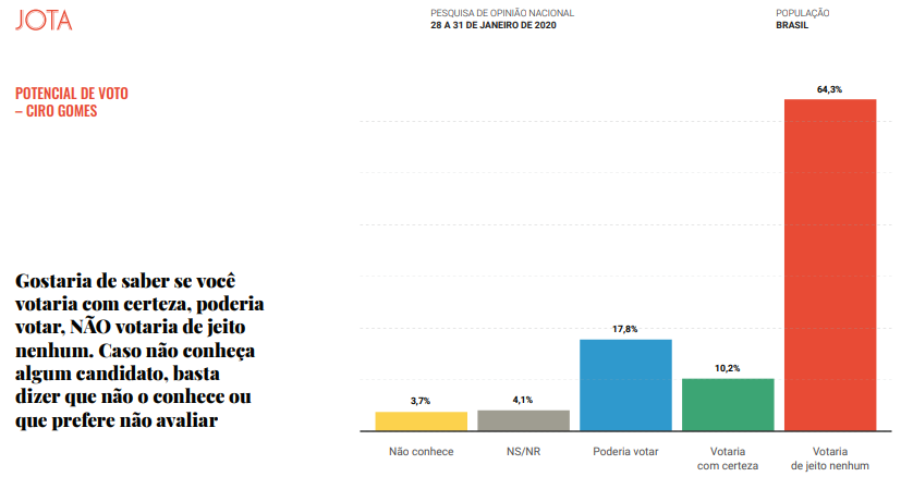 A pesquisa também mediu o potencial de voto em Ciro Gomes. Quase dois terços dos ouvidos (64,3%) afirmam que não votariam no político de jeito nenhum. Já 10,2% dizem que votariam com certeza e 17,8%, que poderiam votar – 7,8% afirma não conhecê-lo ou não souberam responder.