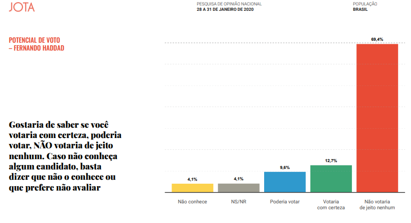 Fernando Haddad foi o político com maior nível de rejeição medido pela pesquisa do JOTA: 69,4% afirmam que não votariam no petista de jeito nenhum. Já 12,7% dizem que votariam com certeza e 9,6%, que poderiam votar – 8,2% afirmaram não conhecê-lo ou não souberam responder.