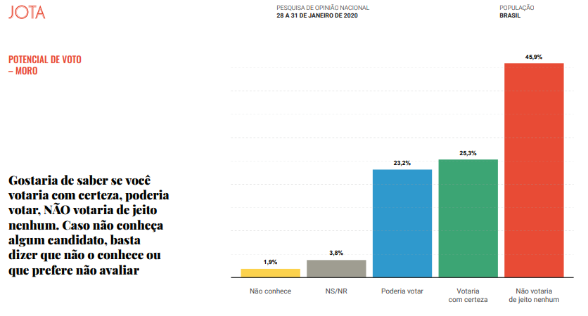 Perguntados sobre o potencial de voto no ministro da Justiça e ex-juiz federal, Sergio Moro, 45,9% disseram que não votariam de jeito nenhum. Ao mesmo tempo, 25,3% votariam com certeza e 23,2% poderiam votar. Ou seja, somados os que votariam com certeza e os que poderiam votar, Moro tem 48,5%. Segundo a pesquisa, 3,8% não responderam e 1,9% afirmam não conhecê-lo.