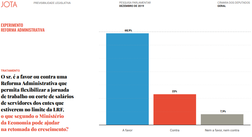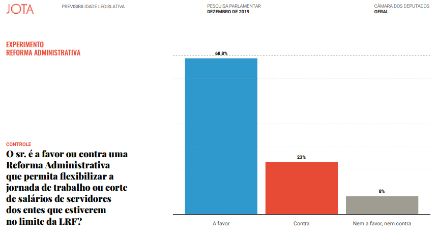 Nesse grupo de controle, 68,8% se disseram a favor de uma reforma administrativa, 23% se disseram contrários e 8% disseram não ser nem a favor nem contra.