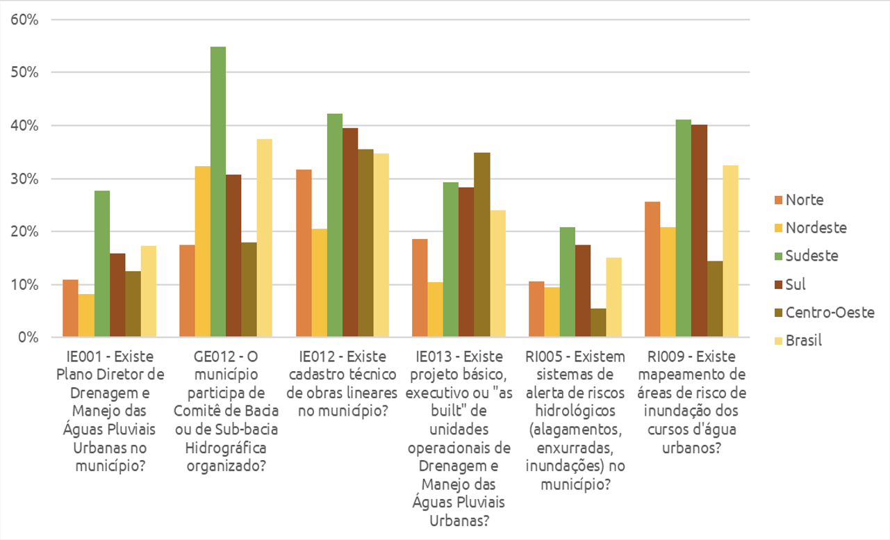 Em complementaridade aos baixos níveis de investimentos, o setor é caracterizado por um grande déficit institucional. Menos da metade dos municípios possuem Plano Diretor, Comitê de Bacia Hidrográfica, cadastro técnico de obras lineares, sistemas de alerta ou mapeamento das áreas de risco no país. A situação é ainda mais precarizada nas regiões mais pobres do país. Esses são mecanismos-chave para a elaboração das políticas públicas no setor, desde a priorização dos investimentos até a tomada de decisão para amenizar ou reduzir os impactos das chuvas, e a ausência deles contribui parar gerar perdas substanciais para a sociedade brasileira.