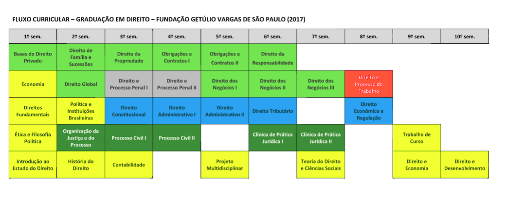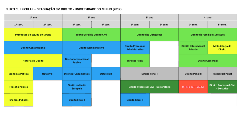 Após participar dessas discussões desde 2013, tenho claro que estamos em uma situação muito complicada para efetivar alterações de impacto no âmbito da educação jurídica brasileira. Na verdade, o modelo brasileiro se consolidou ao longo de décadas sem que houvesse uma real modificação das suas estruturas formais. As inovações na educação jurídica têm ocorrido em razão do amadurecimento da pós-graduação como um importante elemento de melhora na qualificação dos docentes, combinada com a necessidade de algumas instituições e pessoas de empreenderem novos métodos e práticas de ensino, pesquisa e extensão. Podemos comparar quatro fluxos curriculares de instituições. O primeiro é o fluxo curricular da Universidade Estácio de Sá. O segundo é a grade da Escola de Direito da Fundação Getúlio Vargas de São Paulo. O terceiro é o fluxo da Universidade de Brasília. Por fim, o quarto é a grade curricular da Universidade do Minho (Portugal). Cabe notar que foram ignoradas as disciplinas optativas, eletivas e o detalhamento da carga horária. O objetivo da comparação gráfica e superficial é a demonstração de que os cursos de graduação em direito na tradição romano-germânica e continental acabam por possuir muitas semelhanças.