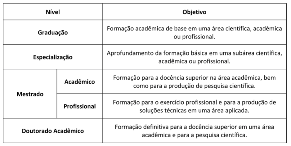 Para que serve a pesquisa em direito? Essa pergunta é muito mais complexa do que poderia parecer. A produção científica em direito pode servir para muitas coisas. A formação em nível de mestrado e de doutorado, também. É possível indicar, contudo, que a formação de mestres e de doutores possui o objetivo de preparar pessoal para desempenhar a atividade de docência e de pesquisa, com a futura formação de novos graduados, profissionais, docentes e pesquisadores. Existe, ainda hoje, uma razoável confusão sobre os amplos objetivos dos vários níveis de formação ofertados no sistema brasileiro de educação superior. A tabela abaixo – de formulação própria – tenta colocar um pouco de ordem nesses níveis: